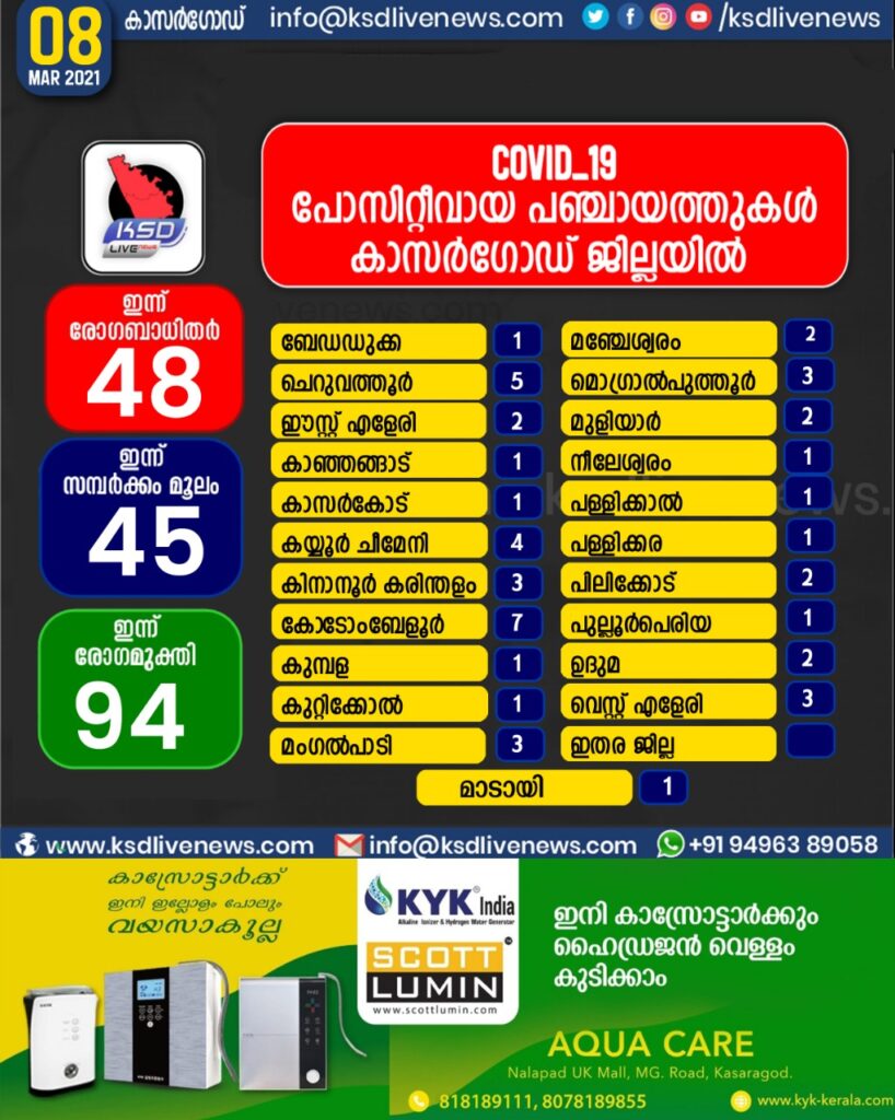 കാസർഗോഡ് ജില്ലയിൽ ഇന്ന് കോവിഡ് സ്ഥിരീകരിച്ചവരുടെ പഞ്ചായത്ത് തിരിച്ചുള്ള സ്ഥിതി വിവര കണക്ക്
