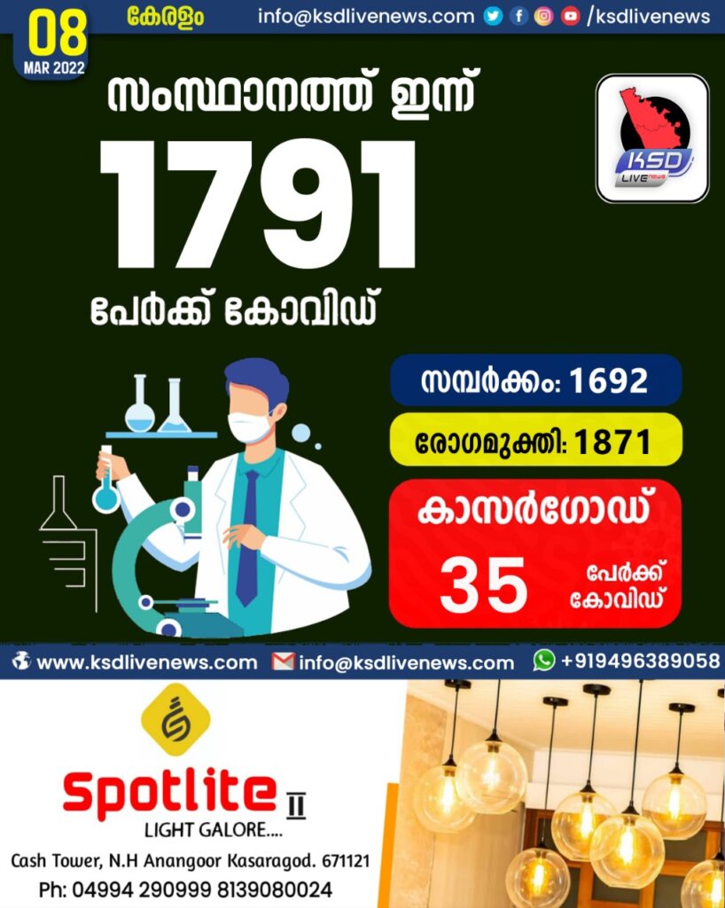 സംസ്ഥാനത്ത് ഇന്ന് 1791 കോവിഡ് സ്ഥിരീകരിച്ചു. സമ്പർക്കം വഴി 1692 പേർക്കും ; ആശ്വാസമായി 1871 പേർക്ക് രോഗമുക്തി ; കാസർഗോഡ് ജില്ലയിൽ 34 പേർക്ക് പുതിയ കോവിഡ് കേസുകൾ ; മരണം 04