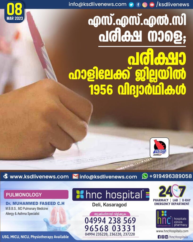 “കാസർകോട് ∙ നാളെ ആരംഭിക്കുന്ന എസ്എസ്എൽസി പരീക്ഷ എഴുതാൻ ജില്ലയിൽ റജിസ്റ്റർ ചെയ്തിട്ടുള്ളത് 19566 വിദ്യാർഥികൾ. ഇതിൽ 9433 പെൺകുട്ടികളാണ്. 156 സെന്ററുകളിലായിട്ടാണു ജില്ലയിൽ പരീക്ഷ നടക്കുന്നത്. കാസർകോട് വിദ്യാഭ്യാസ ജില്ലയിൽ 5746 ആൺകുട്ടികൾ ഉൾപ്പെടെ 10957 പേരും കാഞ്ഞങ്ങാട് വിദ്യാഭ്യാസ ജില്ലയിൽ 4222 പെൺകുട്ടികൾ അടക്കം 8609 വിദ്യാർഥികളുമാണു പരീക്ഷ എഴുതാനായി റജിസ്റ്റർ ചെയ്തത്. കാഞ്ഞങ്ങാട്ട് 75, കാസർകോട്ട് 81 സെന്ററുകളുണ്ട്.  ജില്ലയിൽ കൂടുതൽ കുട്ടികൾ പരീക്ഷ എഴുതുന്നത് കാസർകോട് വിദ്യാഭ്യാസ ജില്ലയിലെ നായന്മാർമൂല തൻബീഹുൽ ഇസ്‌ലാം ഹൈസ്‌കൂളിലാണ്. 855 കുട്ടികളാണ് ഇത്തവണ പരീക്ഷയെഴുതുന്നത്. കുറവ് മൂഡംബയൽ ഗവ.ഹൈസ്കൂളിലാണ്. ഇവിടെ 17 കുട്ടികളാണുള്ളത്.ഗവ.വിദ്യാലയങ്ങളിൽ – 10922, എയ്ഡഡ് – 6859, അൺ എയ്ഡഡ് – 1785 വിദ്യാർഥികളുമാണു ജില്ലയിൽ പരീക്ഷ എഴുതുന്നത്