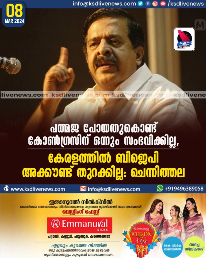 പത്മജ പോയതുകൊണ്ട് കോൺഗ്രസിന് ഒന്നും സംഭവിക്കില്ല, കേരളത്തിൽ ബിജെപി അക്കൗണ്ട് തുറക്കില്ല: ചെന്നിത്തല