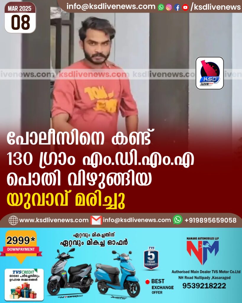 പോലീസിനെ കണ്ട് 130 ഗ്രാം എം.ഡി.എം.എ പൊതി വിഴുങ്ങിയ യുവാവ് മരിച്ചു
