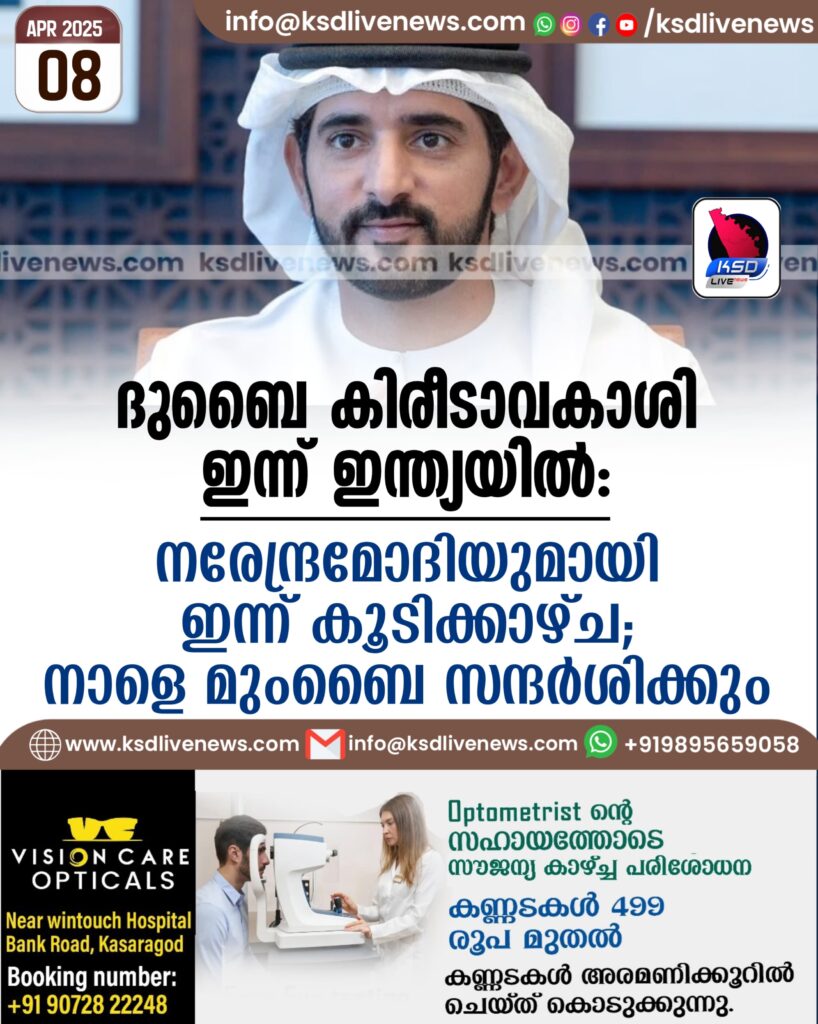 ദുബൈ കിരീ‍ടാവകാശി ഇന്ന് ഇന്ത്യയില്‍: നരേന്ദ്രമോദിയുമായി ഇന്ന് കൂടിക്കാഴ്ച; നാളെ മുംബൈ സന്ദര്‍ശിക്കും