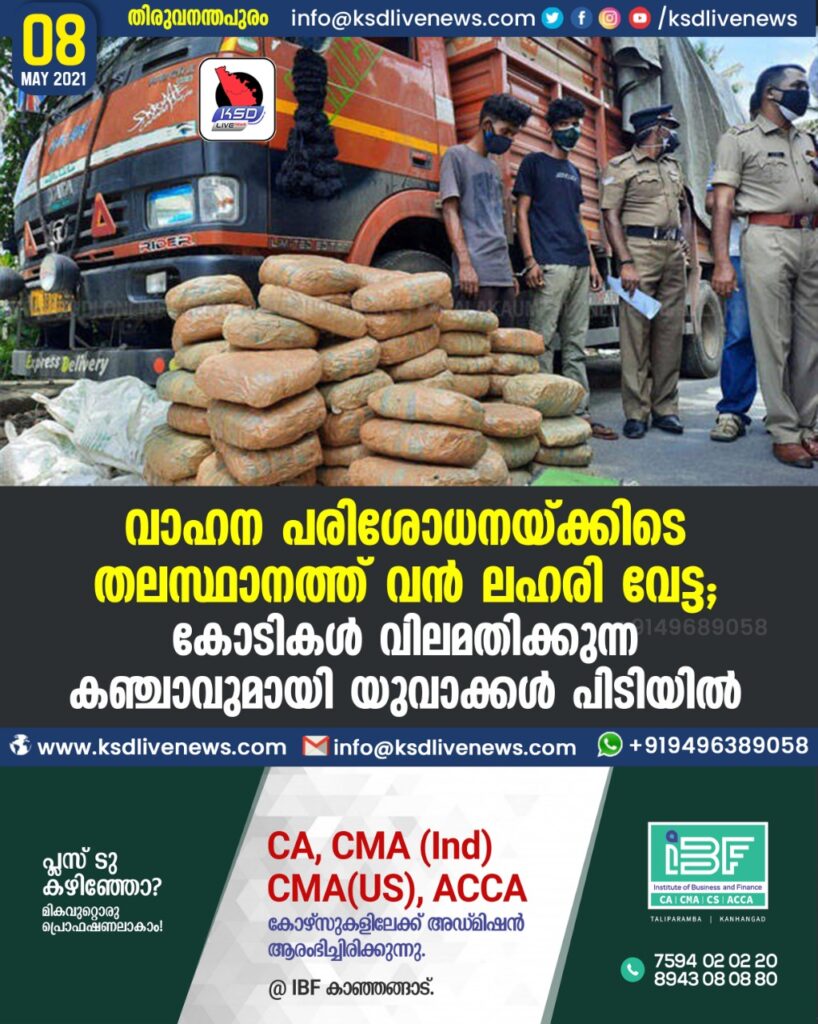 വാഹന പരിശോധനയ്‌ക്കിടെ തലസ്ഥാനത്ത് വന്‍ ലഹരി വേട്ട; കോടികള്‍ വിലമതിക്കുന്ന കഞ്ചാവുമായി യുവാക്കള്‍ പിടിയില്‍