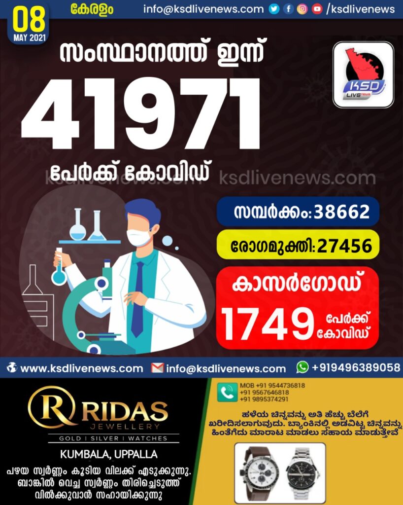 കോവിഡിൽ വിറച്ച് കേരളം ; സംസ്ഥാനത്ത് ഇന്ന് 41971 പേർക്ക് കോവിഡ് സ്ഥിരീകരിച്ചു. സമ്പർക്കം വഴി 38662 പേർക്കും ; ആശ്വാസമായി 27456 പേർക്ക് രോഗ മുക്തിയും ; കാസർഗോഡ് ജില്ലയിൽ 1749 പേർക്ക് പുതിയ കോവിഡ് കേസുകൾ ; മരണം 64