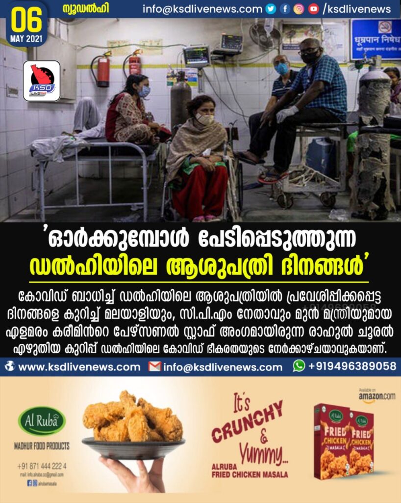 കോവിഡ് അതിരൂക്ഷമായി തുടരുകയാണ് രാജ്യ തലസ്ഥാനമായ ഡല്‍ഹിയില്‍. ഓക്സിജന്‍ ലഭിക്കാതെ ആളുകള്‍ മരിച്ചുവീഴുന്ന വാര്‍ത്തകള്‍ ഉള്‍പ്പെടെ ഡല്‍ഹിയില്‍ നിന്നും വന്നിരുന്നു. കോവിഡ് ബാധിച്ച്‌ ഡല്‍ഹിയിലെ ആശുപത്രിയില്‍ പ്രവേശിപ്പിക്കപ്പെട്ട ദിനങ്ങളെ കുറിച്ച്‌ മലയാളിയായ രാഹുല്‍ ചൂരല്‍ എഴുതിയ കുറിപ്പ് ഡല്‍ഹിയിലെ കോവിഡ് ഭീകരതയുടെ നേര്‍ക്കാഴ്ചയാവുകയാണ്.