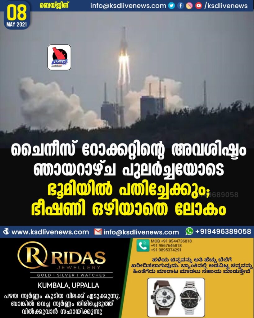 ചൈനീസ് റോക്കറ്റിന്റെ അവശിഷ്ടം ഞായറാഴ്ച പുലര്ച്ചയോടെ ഭൂമിയില് പതിച്ചേക്കും; ഭീഷണി ഒഴിയാതെ ലോകം
