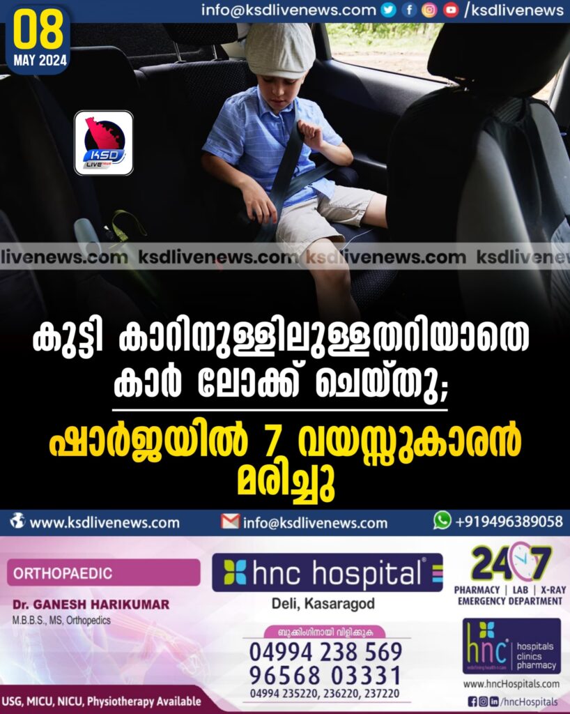 കുട്ടി കാറിനുള്ളിലുള്ളതറിയാതെ കാർ ലോക്ക് ചെയ്തു; ഷാർജയില് 7 വയസ്സുകാരൻ മരിച്ചു
