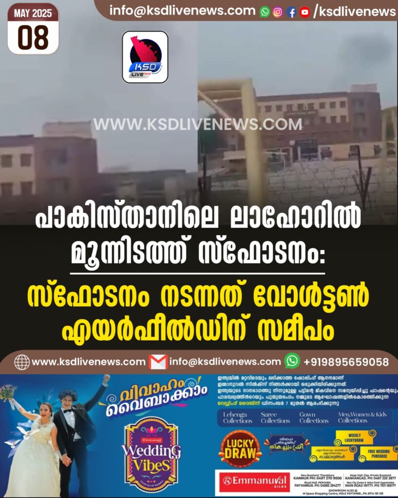 പാകിസ്താനിലെ ലാഹോറില് മൂന്നിടത്ത് സ്ഫോടനം; സ്ഫോടനം നടന്നത് വോള്ട്ടണ് എയര്ഫീല്ഡിന് സമീപം