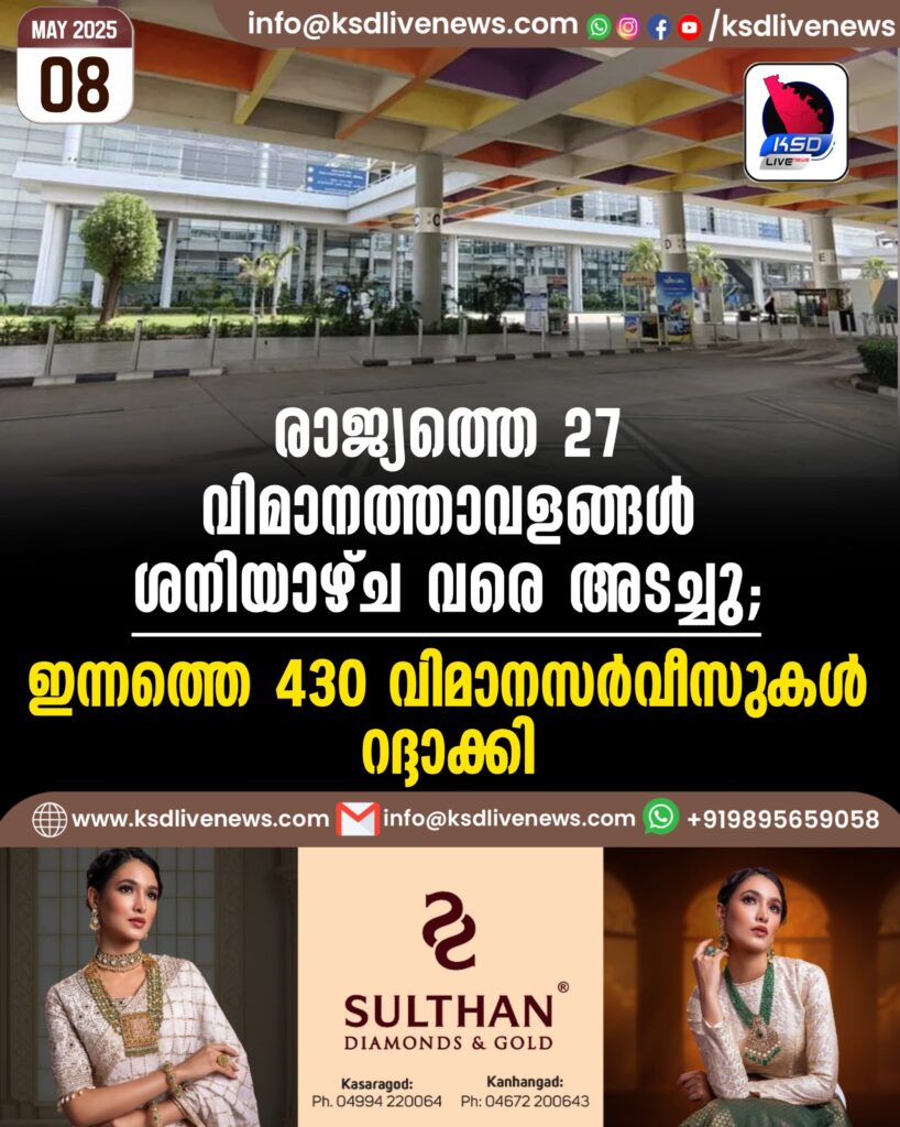 ന്യൂഡല്‍ഹി: രാജ്യത്തിന്റെ വടക്കുപടിഞ്ഞാറ് മധ്യമേഖലകളിലുള്ള 27 വിമാനത്താവളങ്ങളിലെ വാണിജ്യ വിമാന സര്‍വീസുകള്‍ ശനിയാഴ്ച രാവിലെ 5.29 വരെ നിര്‍ത്തിവെച്ചു. വ്യാഴാഴ്ച മാത്രം 430 സര്‍വീസുകളാണ് റദ്ദാക്കിയത്. രാജ്യത്തെ ആകെ ഷെഡ്യൂള്‍ഡ് സര്‍വീസുകളുടെ മൂന്നുശതമാനമാണ് ഇത്. പാകിസ്താന്‍ 147 വിമാനസര്‍വീസുകള്‍ റദ്ദാക്കിയെന്നും റിപ്പോര്‍ട്ടുകളുണ്ട്. അവരുടെ പ്രതിദിന സര്‍വീസുകളുടെ 17 ശതമാനമാണിത്.