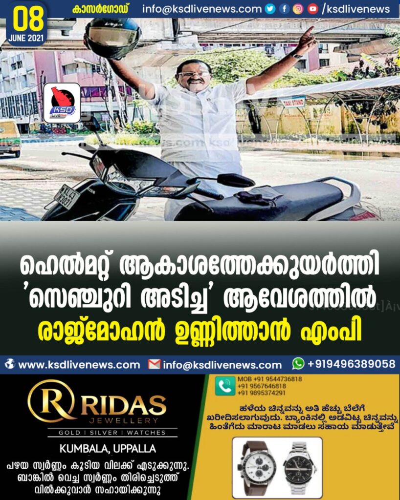 ഹെൽമറ്റ് ആകാശത്തേക്കുയർത്തി ‘സെഞ്ചുറി അടിച്ച’ ആവേശത്തിൽ രാജ്മോഹൻ ഉണ്ണിത്താൻ എംപി