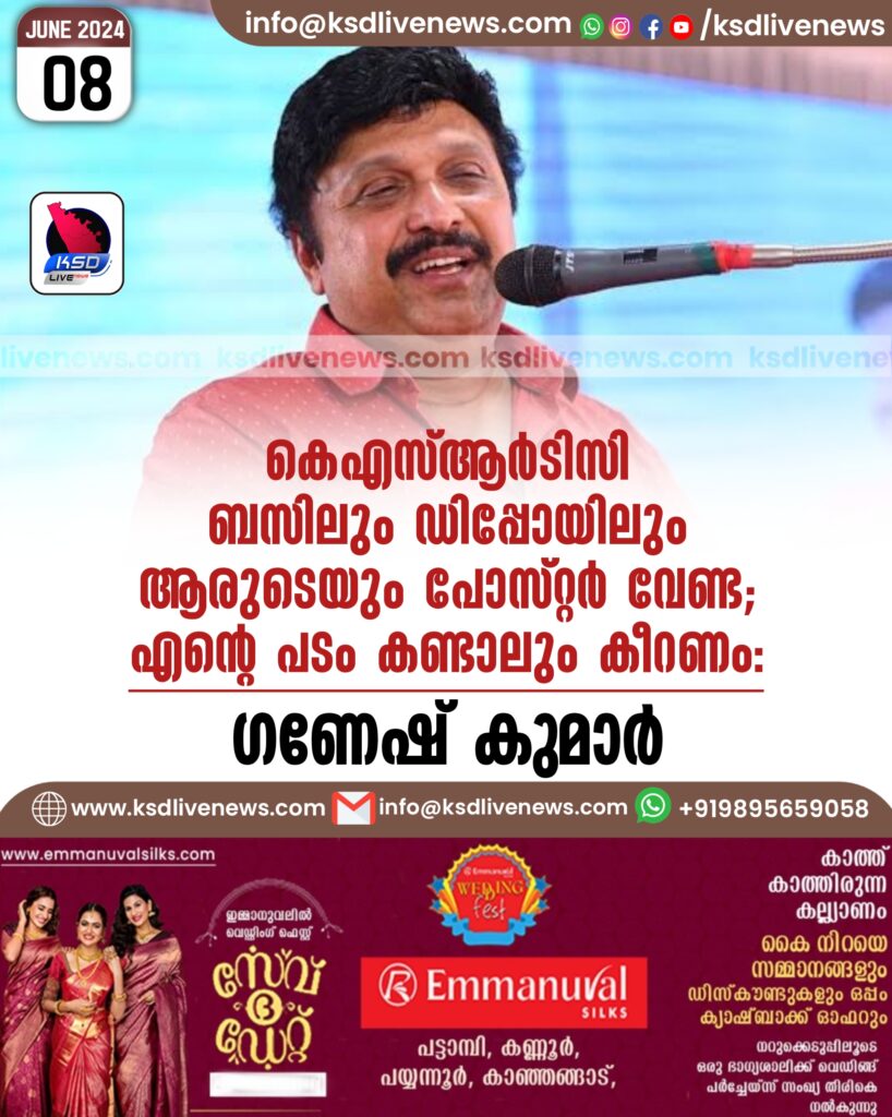 കെ.എസ്.ആർ.ടി.സി ബസിലും ഡിപ്പോയിലും ആരുടെയും പോസ്റ്റര്‍ വേണ്ട; എന്റെ പടം കണ്ടാലും കീറണം: ഗണേഷ് കുമാര്‍