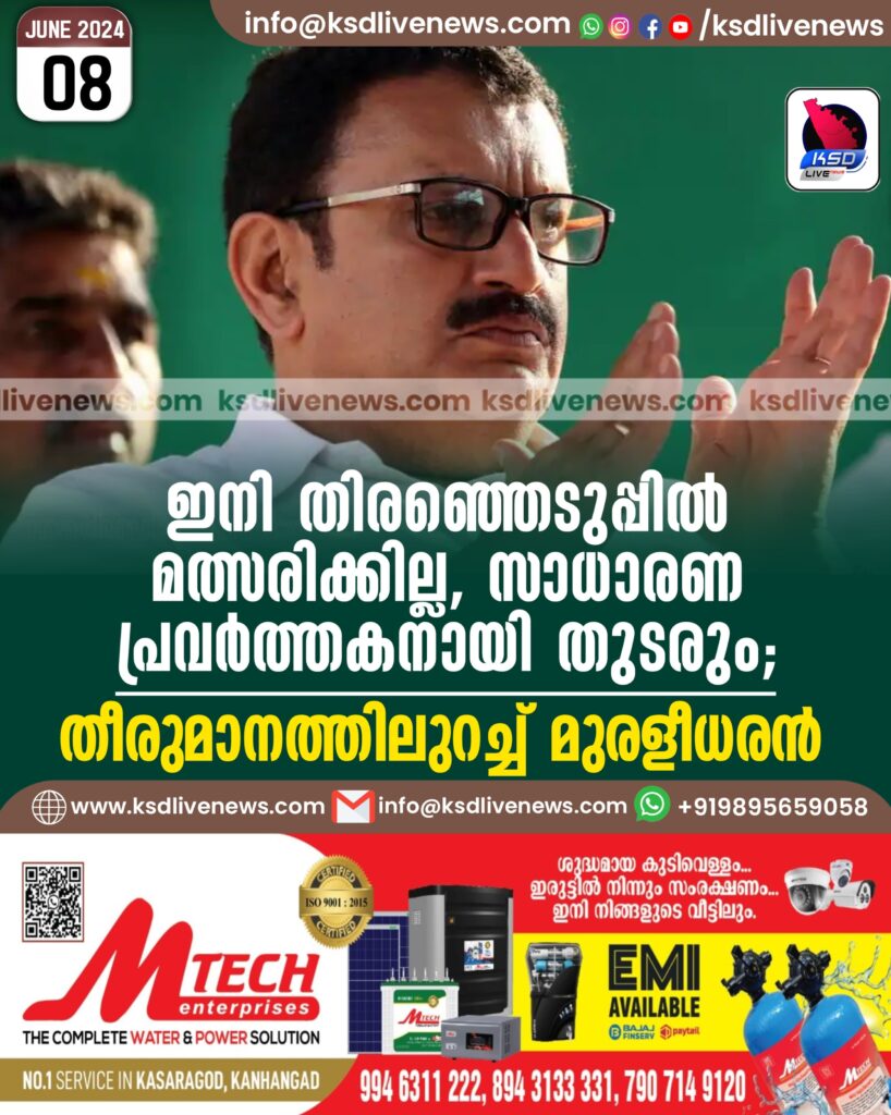 ഇനി തിരഞ്ഞെടുപ്പില് മത്സരിക്കില്ല, സാധാരണ പ്രവര്ത്തകനായി തുടരും; തീരുമാനത്തിലുറച്ച് മുരളീധരന്