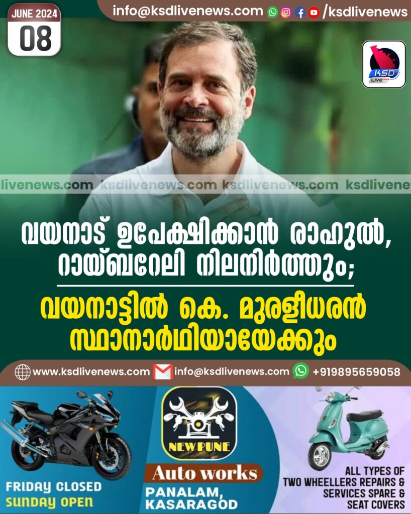 വയനാട് ഉപേക്ഷിക്കാന് രാഹുൽ, റായ്ബറേലി നിലനിർത്തും; വയനാട്ടിൽ കെ. മുരളീധരൻ സ്ഥാനാർഥിയായേക്കും