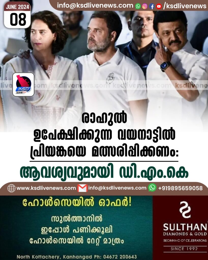 ചെന്നൈ: രാഹുല് ഗാന്ധി വയനാട് ഉപേക്ഷിക്കുമ്ബോള് അവിടെ പ്രിയങ്കാഗാന്ധിയെ സ്ഥാനാർഥിയാക്കണമെന്ന ആവശ്യവുമായി ഡി.എം.കെ.