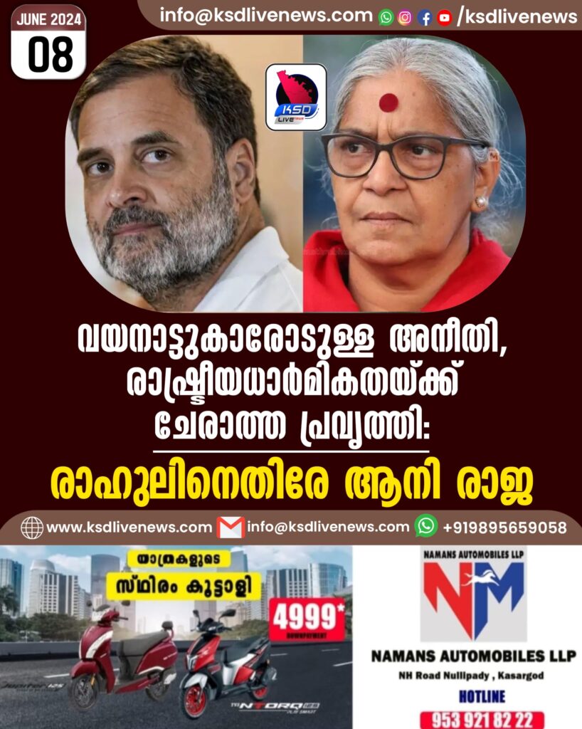 നേതാവ് ആനി രാജ. വയനാട് മണ്ഡലത്തില് ആനിയെ 3,64,422 വോട്ടുകള്ക്ക് പരാജയപ്പെടുത്തിയായിരുന്നു രാഹുലിന്റെ വിജയം.