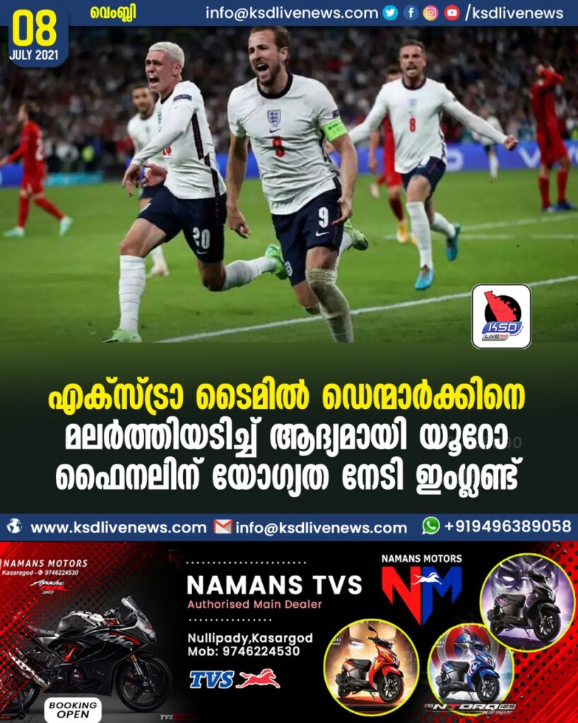 എക്സ്ട്രാ ടൈമില് ഡെന്മാര്ക്കിനെ മലര്ത്തിയടിച്ച് ആദ്യമായി യൂറോ ഫൈനലിന് യോഗ്യത നേടി ഇംഗ്ലണ്ട്