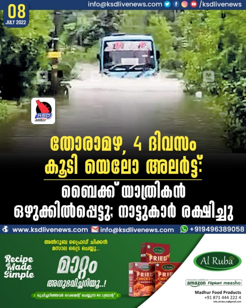 തോരാമഴ, 4 ദിവസം കൂടി യെലോ അലർട്ട്: ബൈക്ക് യാത്രികൻ ഒഴുക്കിൽപ്പെട്ടു; നാട്ടുകാർ രക്ഷിച്ചു