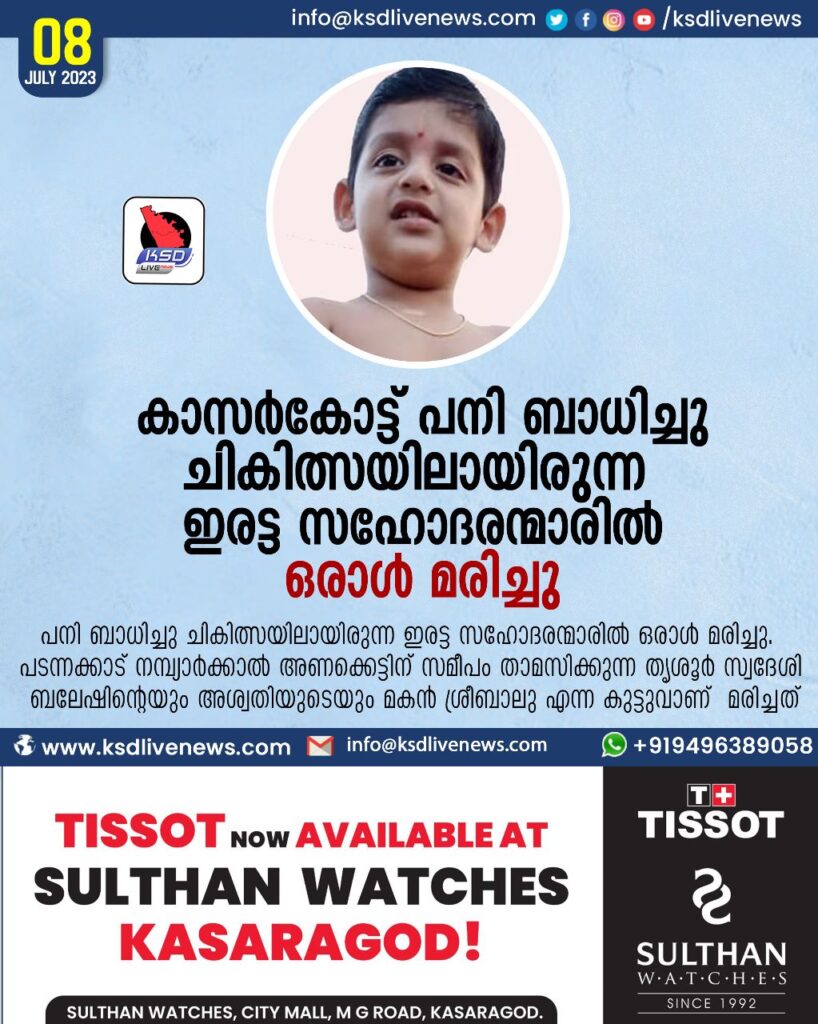 കാസർകോട്ട് പനി ബാധിച്ചു ചികിത്സയിലായിരുന്ന ഇരട്ട സഹോദരന്മാരിൽ ഒരാൾ മരിച്ചു
