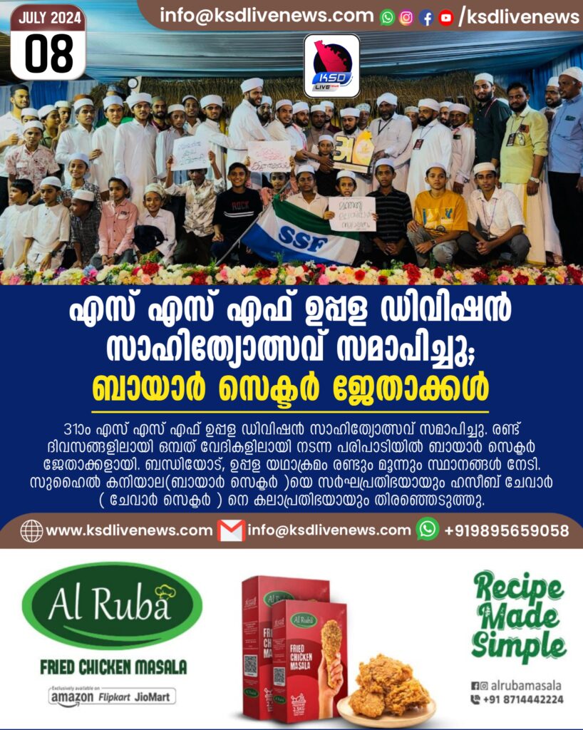 ഉപ്പള : 31ാം എസ് എസ് എഫ് ഉപ്പള ഡിവിഷൻ സാഹിത്യോത്സവ് സമാപിച്ചു. രണ്ട് ദിവസങ്ങളിലായി ഒമ്പത് വേദികളിലായി നടന്ന പരിപാടിയിൽ ബായാർ സെക്ടർ ജേതാക്കളായി. ബന്ധിയോട്, ഉപ്പള യഥാക്രമം രണ്ടും മൂന്നും സ്ഥാനങ്ങൾ നേടി. സുഹൈൽ കനിയാല(ബായാർ സെക്ടർ )യെ സർഘപ്രതിഭയായും ഹസീബ് ചേവാർ ( ചേവാർ സെക്ടർ ) നെ കലാപ്രതിഭയായും തിരഞ്ഞെടുത്തു. എസ് എസ് എഫ് കേരള ഫിനാൻസ് സെക്രട്ടറി സയ്യിദ് മുനീറും അഹ്ദൽ തങ്ങൾ ഉദ്ഘാടനം ചെയ്ത സമാപന പരിപാടിയിൽ ഷഫീഖ് സഖാഫി സോങ്കാൽ അധ്യക്ഷത വഹിച്ചു. എസ് വൈ എസ് കാസർഗോഡ് ജില്ലാ ഫിനാൻസ് സെക്രട്ടറി മൂസ സഖാഫി കളത്തൂർ അനുമോദന പ്രഭാഷണം നടത്തി.അബ്ദുൽ അസീസ് അട്ടഗോളി സ്വാഗതവും ആസിഫ് ഹിമമി നന്ദിയും പറഞ്ഞു.