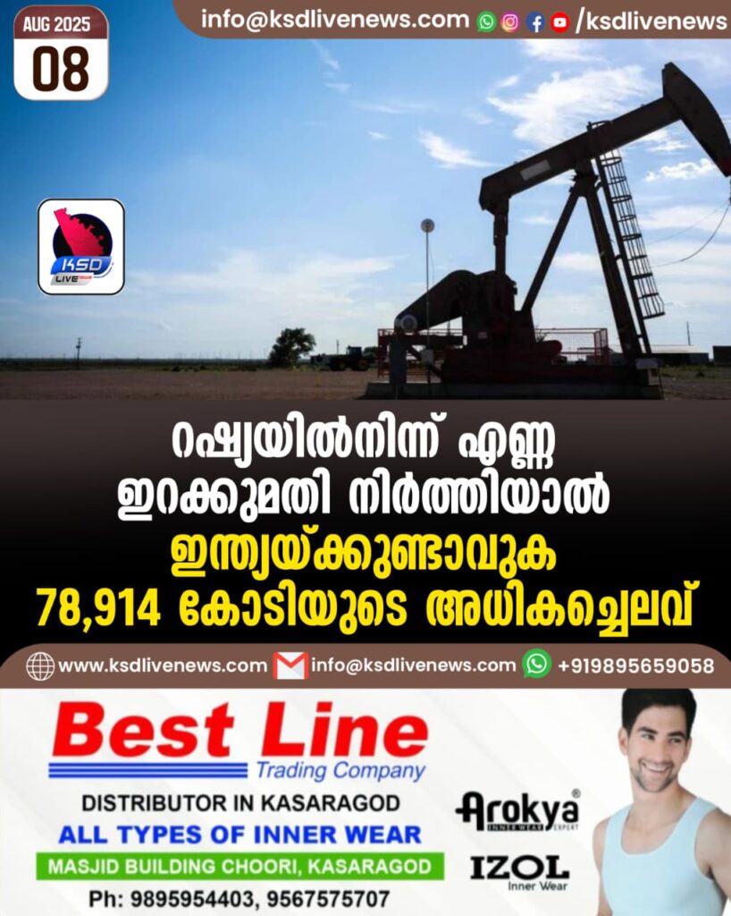 യുഎസ് ചുമത്തിയ അധികത്തീരുവയുടെ പശ്ചാത്തലത്തില് ഇന്ത്യ, റഷ്യയില് നിന്നുള്ള ക്രൂഡ് ഓയില് ഇറക്കുമതി നിര്ത്തിയാല് അത് ഇന്ത്യയുടെ ക്രൂഡ് ഓയില് ഇറക്കുമതി ചെലവില് വന് വര്ധനവുണ്ടാക്കുമെന്ന് സ്റ്റേറ്റ് ബാങ്ക് ഓഫ് ഇന്ത്യ (എസ്ബിഐ) പ്രസിദ്ധീകരിച്ച ഒരു റിപ്പോര്ട്ടില് പറയുന്നു. റഷ്യയില് നിന്നുള്ള ക്രൂഡ് ഇറക്കുമതി നിര്ത്തിയാല് അതോടെ ഈ സാമ്പത്തിക വര്ഷത്തില് ഇന്ത്യയുടെ ക്രൂഡ് ഓയില് ഇറക്കുമതിയില് 78914 കോടി രൂപയുടെ (9 ബില്യണ് ഡോളര്) വര്ധനവുണ്ടാകുമെന്നാണ് എസ്ബിഐ പറയുന്നത്. ഇത് അടുത്ത സാമ്പത്തിക വര്ഷം 1,05219 കോടിയായി (12 ബില്യണ് ഡോളര്) വര്ധിക്കുമെന്നും റിപ്പോര്ട്ടിലുണ്ട്.