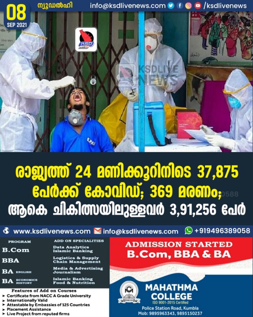 രാജ്യത്ത് 24 മണിക്കൂറിനിടെ 37,875 പേർക്ക് കോവിഡ്; 369 മരണം; ആകെ ചികിത്സയിലുള്ളവർ 3,91,256 പേർ