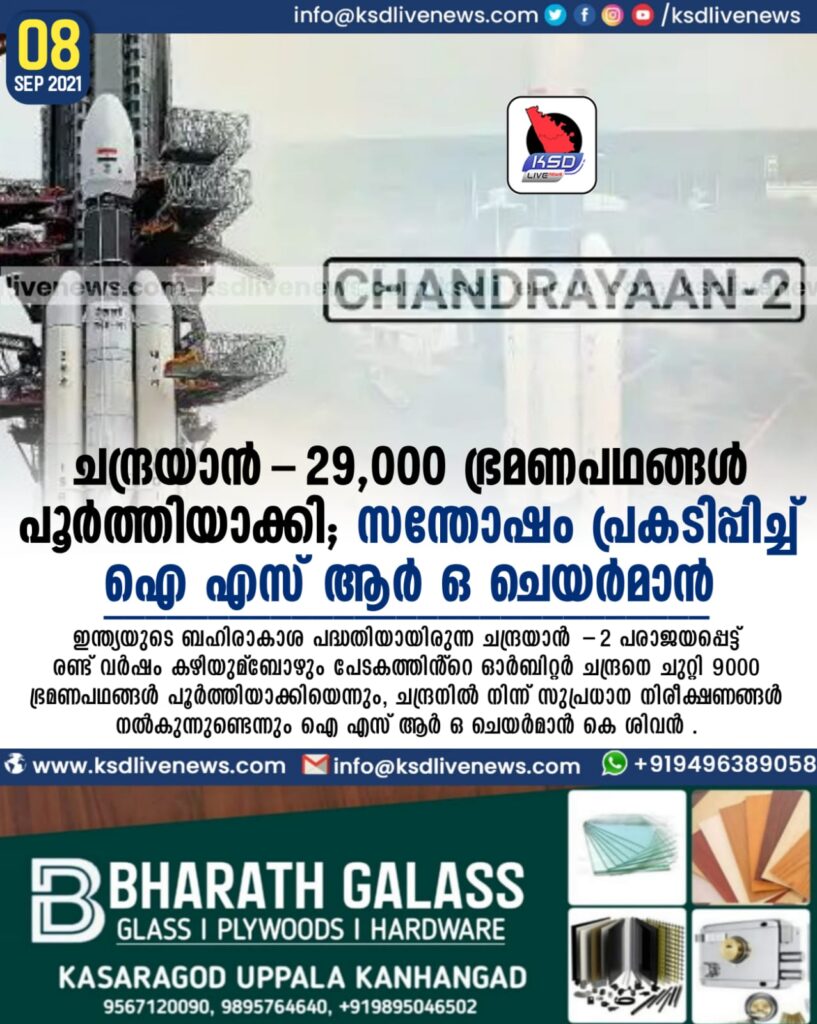 ഇന്ത്യയുടെ ബഹിരാകാശ പദ്ധതിയായിരുന്ന ചന്ദ്രയാന് -2 പരാജയപ്പെട്ട് രണ്ട് വര്ഷം കഴിയുമ്ബോഴും പേടകത്തിന്്റെ ഓര്ബിറ്റര് ചന്ദ്രനെ ചുറ്റി 9000 ഭ്രമണപഥങ്ങള് പൂര്ത്തിയാക്കിയെന്നും, ചന്ദ്രനില് നിന്ന് സുപ്രധാന നിരീക്ഷണങ്ങള് നല്കുന്നുണ്ടെന്നും ഐ എസ് ആര് ഒ ചെയര്മാന് കെ ശിവന് . പേടകത്തിന്്റെ ഇന്ബോര്ഡ് ഉപകരണങ്ങള് നാമമാത്രമായി പ്രവര്ത്തിക്കുന്നുണ്ടെന്നും അദ്ദേഹം കൂട്ടിച്ചേര്ത്തു.ചന്ദ്രയാന്-2 ബഹിരാകാശ പേടകത്തിന്്റെ രണ്ട് വര്ഷത്തെ പ്രവര്ത്തനം പൂര്ത്തിയാക്കിയതിന്്റെ ഓര്മയ്ക്കായി നടത്തിയ ലൂണാര് സയന്സ് വര്ക്ക് ഷോപ്പ്-2021 ലാണ് അദ്ധേഹത്തിന്്റെ വെളിപ്പെടുത്തല്.