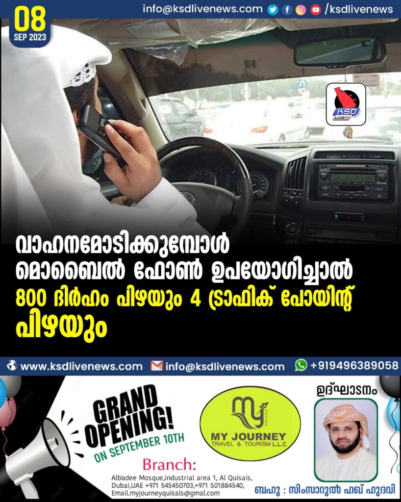 വാഹനമോടിക്കുമ്പോൾ മൊബൈൽ ഫോണ്‍ ഉപയോഗിച്ചാൽ 800 ദിർഹം പിഴയും 4 ട്രാഫിക് പോയിന്റ് പിഴയും
