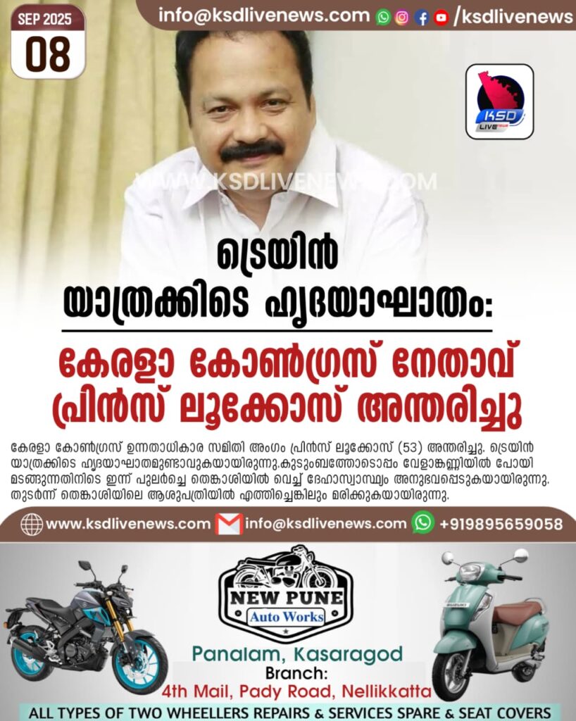 ട്രെയിൻ യാത്രക്കിടെ ഹൃദയാഘാതം: കേരളാ കോൺഗ്രസ് നേതാവ് പ്രിൻസ് ലൂക്കോസ് അന്തരിച്ചു