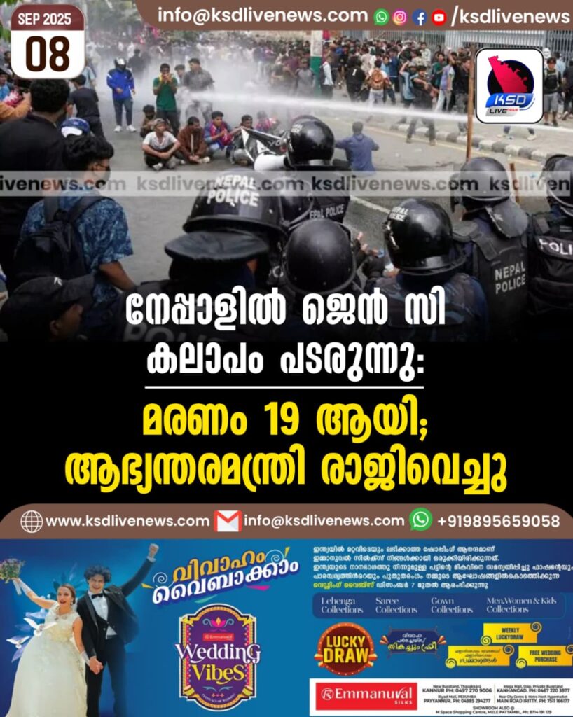 നേപ്പാളിൽ ‘ജെൻ സി’ കലാപം പടരുന്നു: മരണം 19 ആയി; ആഭ്യന്തരമന്ത്രി രാജിവെച്ചു
