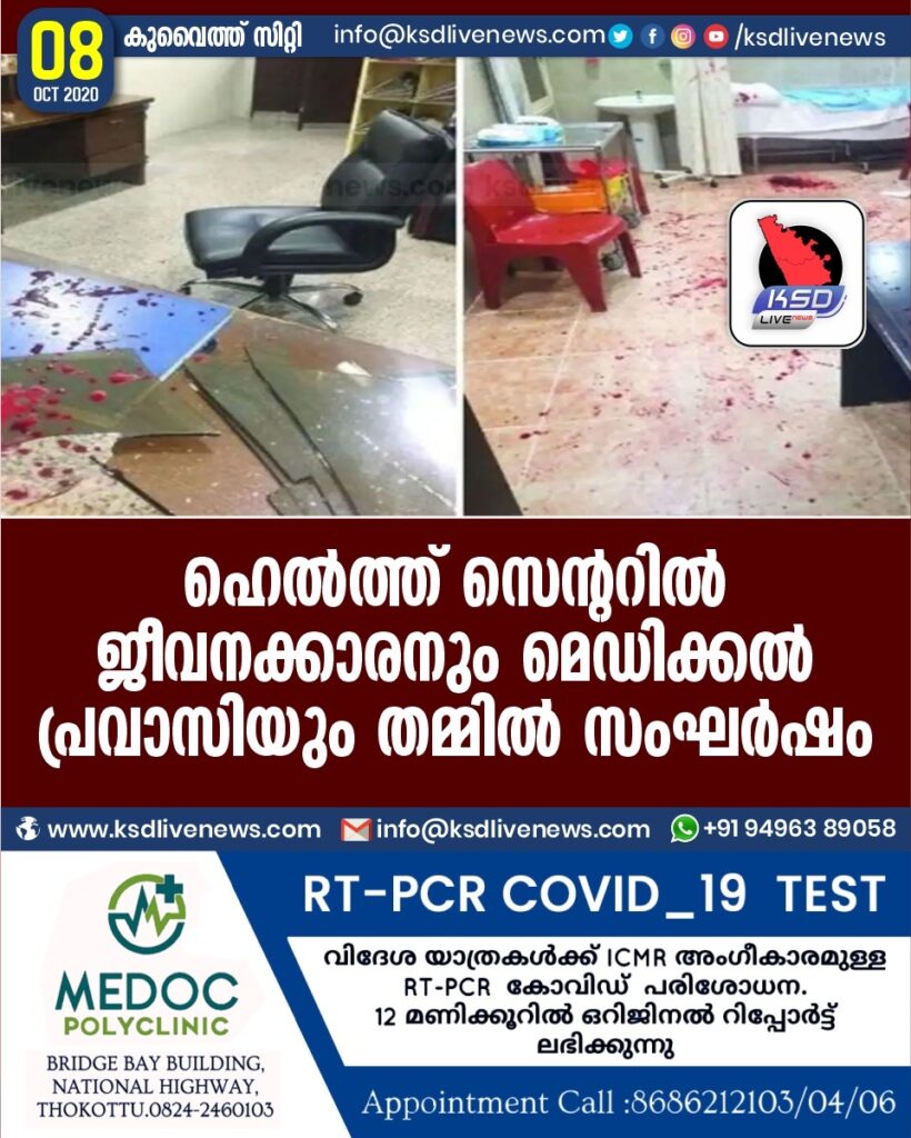 അടിപിടിയില് ഇരുവര്ക്കും പരിക്കേറ്റിട്ടുണ്ട്. ഇതിന് പുറമെ ഹെല്ത്ത് സെന്ററിലെ ഫ്രണ്ട് ഡസ്ക്കിലെ ജനല് ചില്ലുകള് തകരുകയും ചെയ്തു. ആശുപത്രി ജീവനക്കാരാണ് സുരക്ഷാ വകുപ്പുകളെ വിവരമറിയിച്ചത്. സുരക്ഷാ ഉദ്യോഗസ്ഥര് സ്ഥലത്തെത്തി ജീവനക്കാരനെ ഡിസ്ട്രിക്ട് പൊലീസ് സ്റ്റേഷനിലേക്ക് കൊണ്ടുപോയി.സുരക്ഷാ ഉദ്യോഗസ്ഥര് സ്ഥലത്തെത്തി ജീവനക്കാരനെ ഡിസ്ട്രിക്ട് പൊലീസ് സ്റ്റേഷനിലേക്ക് കൊണ്ടുപോയി.സുരക്ഷാ ഉദ്യോഗസ്ഥര് സ്ഥലത്തെത്തി ജീവനക്കാരനെ ഡിസ്ട്രിക്ട് പൊലീസ് സ്റ്റേഷനിലേക്ക് കൊണ്ടുപോയി.പ്രവാസിയെ മുബാറക് ആശുപത്രിയില് പ്രവേശിപ്പിച്ചു.