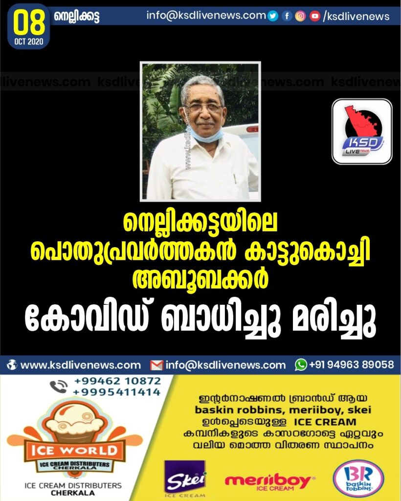 നെല്ലിക്കട്ടയിലെ പൊതുപ്രവർത്തകൻ കാട്ടുകൊച്ചി അബൂബക്കർ കോവിഡ് ബാധിച്ചു മരിച്ചു