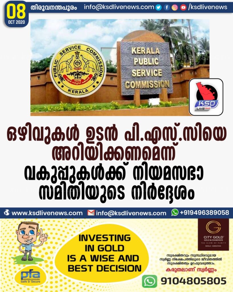 ഒഴിവുകൾ ഉടൻ പി.എസ്.സിയെ അറിയിക്കണമെന്ന് വകുപ്പുകൾക്ക് നിയമസഭാ സമിതിയുടെ നിർദ്ദേശം