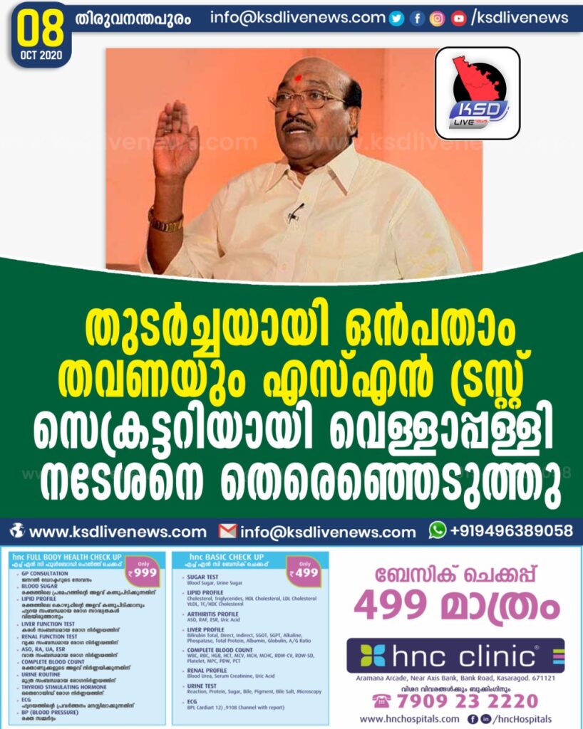 തുടർച്ചയായി ഒൻപതാം തവണയും എസ്എൻ ട്രസ്റ്റ്‌ സെക്രട്ടറിയായി വെള്ളാപ്പള്ളി നടേശനെ തെരെഞ്ഞെടുത്തു
