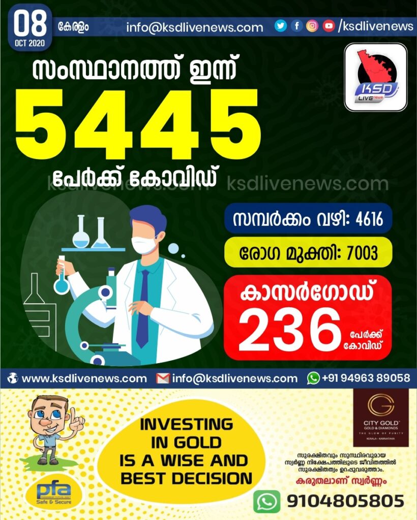 കോവിഡിന്ന് അല്പം ശമനം ; സംസ്ഥാനത്ത് ഇന്ന് 5445 പേർക്ക് കോവിഡ് സ്ഥിരീകരിച്ചു. സമ്പർക്കം വഴി 4616 പേർക്കും.രോഗ മുക്തി 7003 പേർക്കും. കാസർഗോഡ് ജില്ലയിൽ ഇന്ന് 236 പേർക്ക് കോവിഡ് സ്ഥിരീകരിച്ചു. മരണം 24