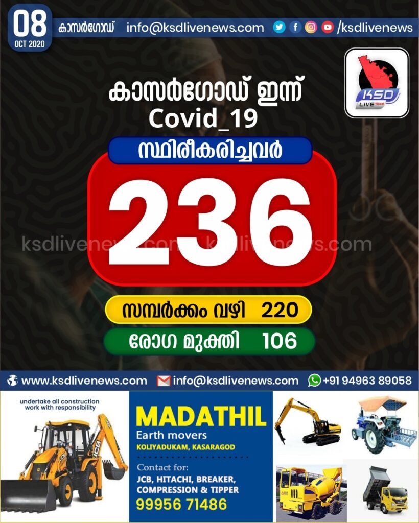 ഇന്ന് (ഒക്ടോബര് 8) ജില്ലയില് 236 പേര്ക്ക് കൂടി കോവിഡ് 19 പോസിറ്റീവായി. സമ്പര്ക്കത്തിലൂടെ 220 പേര്ക്കും ഇതരസംസ്ഥാനത്ത് നിന്നെത്തിയ ഏഴ് പേര്ക്കും വിദേശത്ത് നിന്നെത്തിയ ഒമ്പത് പേര്ക്കുമാണ് ഇന്ന് കോവിഡ് സ്ഥിരീകരിച്ചത്. 106 പേര്ക്കാണ് ഇന്ന് കോവിഡ് നെഗറ്റീവായതെന്ന് ജില്ലാ മെഡിക്കല് ഓഫീസര് (ഹെല്ത്ത്) ഡോ.എ.വി. രാംദാസ് പറഞ്ഞു.