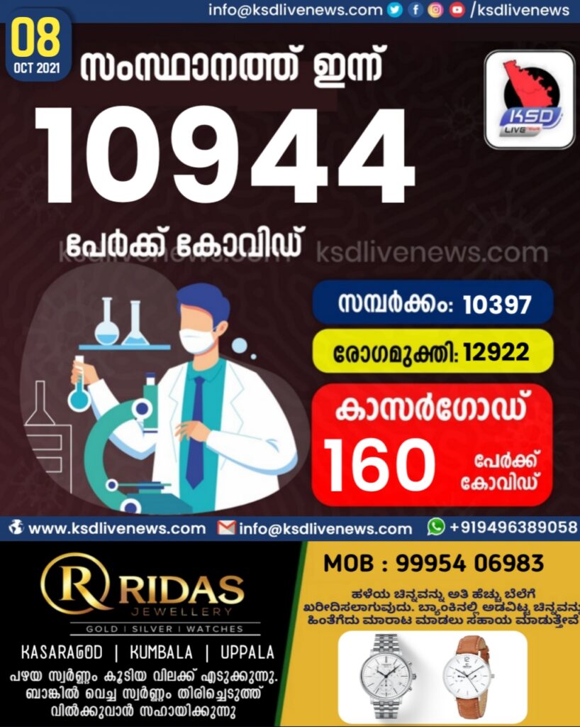 സംസ്ഥാനത്ത് ഇന്ന് 10944 പേർക്ക് കോവിഡ് സ്ഥിരീകരിച്ചു. സമ്പർക്കം വഴി 10397 പേർക്കും ; ആശ്വാസമായി 12922 പേർക്ക് രോഗ മുക്തിയും ; കാസർഗോഡ് ജില്ലയിൽ 160 പേർക്ക് പുതിയ കോവിഡ് കേസുകൾ ; മരണം 120
