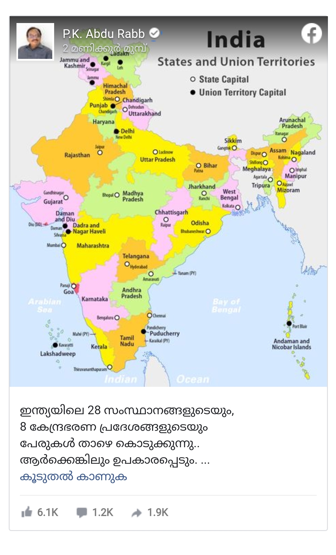 മലപ്പുറം: ഇന്ത്യയിൽ 35 സംസ്ഥാനങ്ങൾ അല്ലേയെന്ന് ചോദിച്ച വിദ്യാഭ്യാസ മന്ത്രി വി. ശിവൻകുട്ടിയെ ഉന്നമിട്ട് മുൻ വിദ്യാഭ്യാസ മന്ത്രി പി.കെ അബ്ദുറബിന്റെ ഫെയ്സ്ബുക്ക് പോസ്റ്റ്. സംസ്ഥാനങ്ങളുടെയും കേന്ദ്രഭരണപ്രദേശങ്ങളുടെയും എണ്ണവും പേരുകളും എണ്ണിപ്പറഞ്ഞ് ശിവൻകുട്ടിയെ പരിഹസിച്ചാണ് അബ്ദുറബിന്റെ പ്രതികരണം. ആർക്കെങ്കിലും ഉപകാരപ്പെടുമെന്ന വാചകത്തോടെ ഇന്ത്യയുടെ ഭൂപടവും ഫെയ്സ്ബുക്ക് കുറിപ്പിനൊപ്പം ചേർത്തിട്ടുണ്ട്.