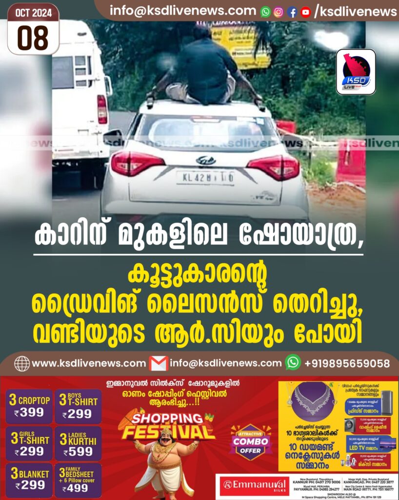 കാറിന് മുകളിലെ ‘ഷോ’യാത്ര, കൂട്ടുകാരന്റെ ഡ്രൈവിങ് ലൈസന്സ് തെറിച്ചു, വണ്ടിയുടെ ആര്.സിയും പോയി