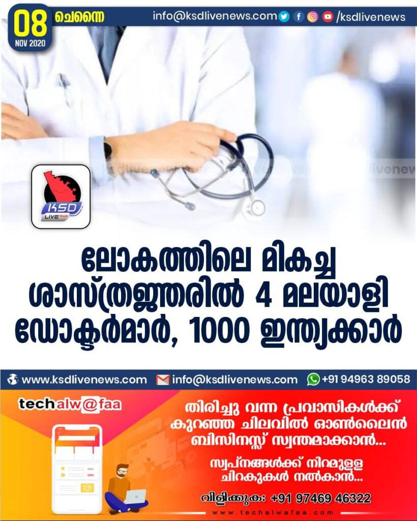 ലോകത്തിലെ മികച്ച ശാസ്ത്രജ്ഞരിൽ 4 മലയാളി ഡോക്ടർമാർ , 1000 ഇന്ത്യക്കാർ