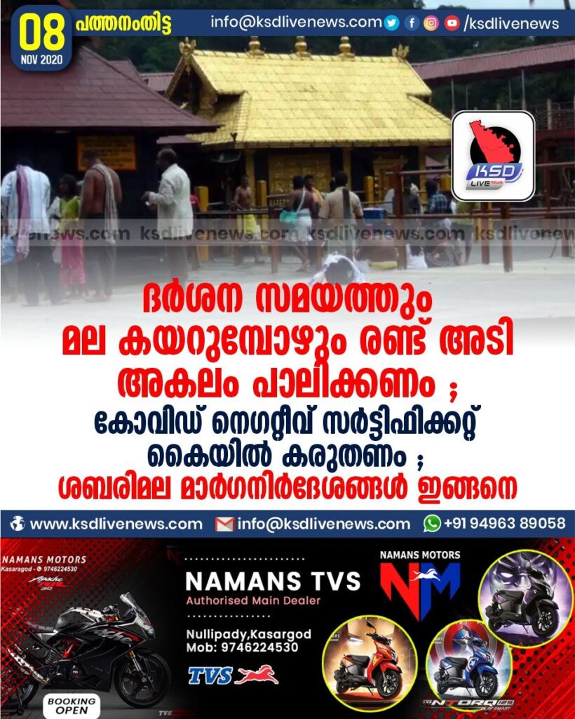 ദർശന സമയത്തും മല. കയറുമ്പോഴും രണ്ട് അടി അകലം പാലിക്കണം ; കോവിഡ് നെഗറ്റീവ് സർട്ടിഫിക്കറ്റ് കൈയിൽ കരുതണം ; ശബരിമല മാർഗനിർദേശങ്ങൾ ഇങ്ങനെ