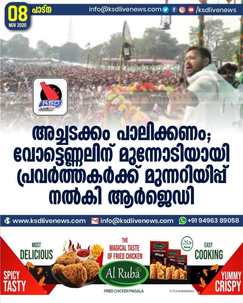 അച്ചടക്കം പാലിക്കണം; വോട്ടെണ്ണലിന് മുന്നോടിയായി പ്രവര്ത്തകര്ക്ക് മുന്നറിയിപ്പ് നല്കി ആര്ജെഡി