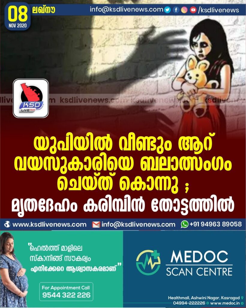 യുപിയിൽ വീണ്ടും ആറ് വയസുകാരിയെ ബലാത്സംഗം ചെയ്ത് കൊന്നു ; മൃതദേഹം കരിമ്പിൻ തോട്ടത്തിൽ