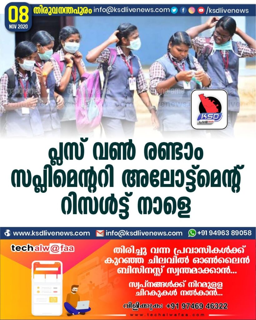 പ്ലസ് വൺ രണ്ടാം സപ്ലിമെന്ററി അലോട്ട്മെന്റ് റിസൾട്ട് നാളെ