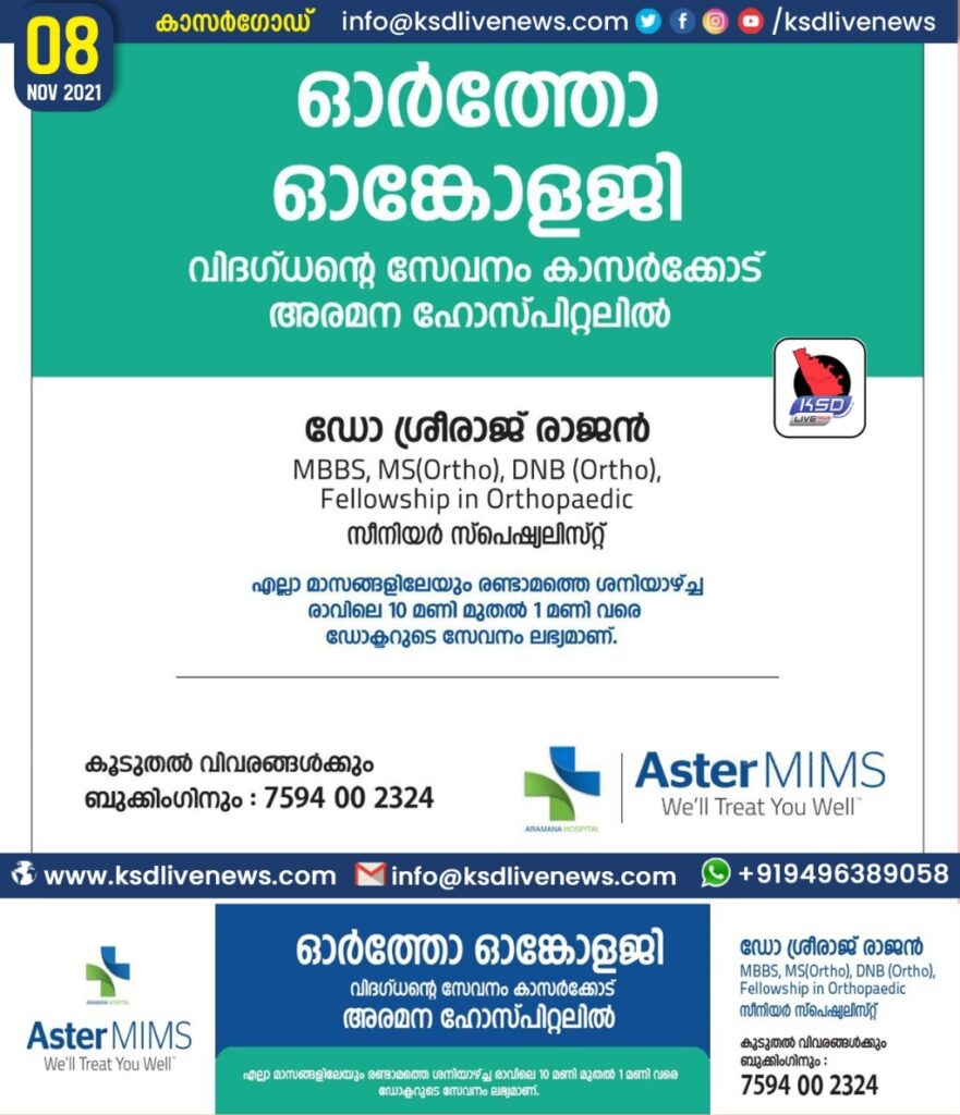 കോഴിക്കോട് ആസ്റ്റര്‍ മിംസ് ഹോസ്പിറ്റലിലെ പ്രശസ്ത ഓർത്തോ ഓങ്കോ(കാൻസർ) വിഭാഗം ഡോക്ടർ ശ്രീറാജ് രാജൻ ന്റെ സേവനം മാസത്തിലെ രണ്ടാമത്തെ ശനിയാഴച്ച 13/11/2021രാവിലെ 10 Am to 1 pm