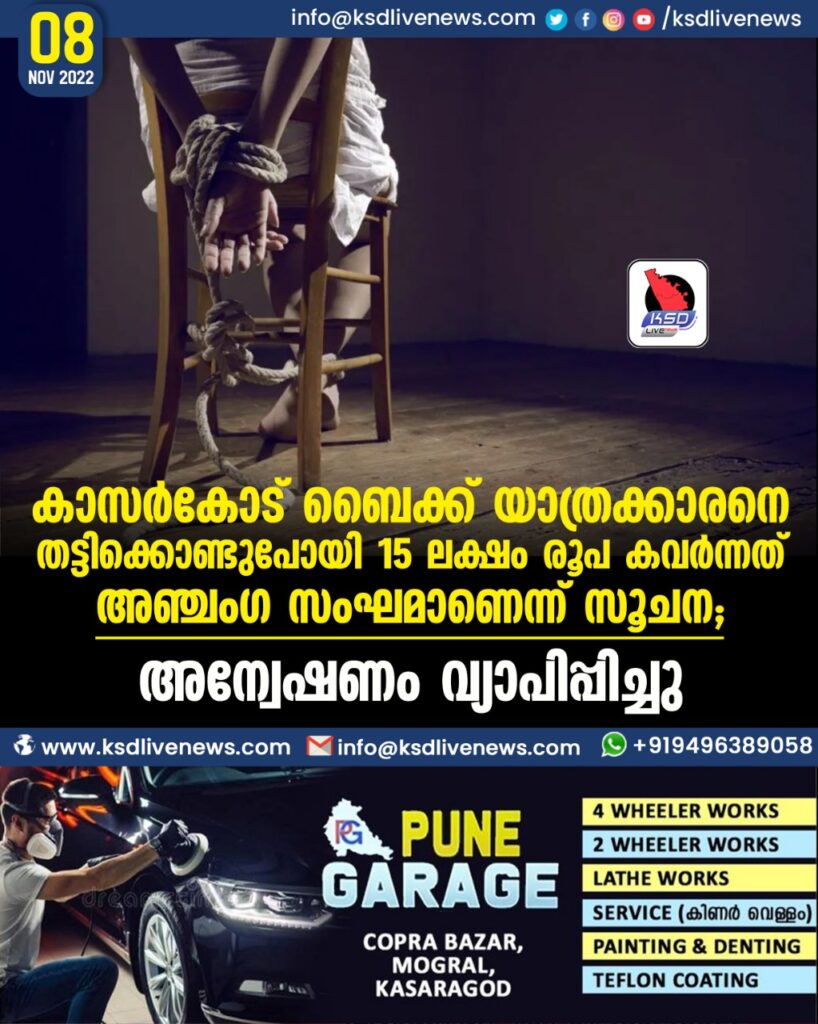 കാസർകോട് ബൈക്ക് യാത്രക്കാരനെ തട്ടിക്കൊണ്ടുപോയി 15 ലക്ഷം രൂപ കവര്ന്നത് അഞ്ചംഗ സംഘമാണെന്ന് സൂചന; അന്വേഷണം വ്യാപിപ്പിച്ചു