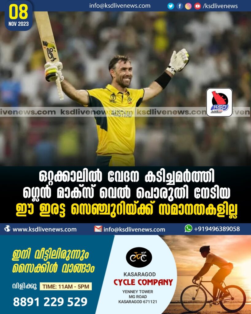 മുംബൈ: രക്ഷകൻ… ഒരേയൊരു പേര്… ഗ്ലെൻ മാക്സ്വെൽ. ഓസ്ട്രേലിയക്കാർക്ക് മാക്സ്വെൽ ഇന്ന് ദൈവതുല്യനാണ്. അത്രമേൽ ആ രാജ്യം ഈ സൂപ്പർ താരത്തോട് കടപ്പെട്ടിരിക്കുന്നു. ഒരു ഘട്ടത്തിൽ ആടിയുലഞ്ഞ ഓസീസ് ക്രിക്കറ്റ് ടീമിനെ വേദന സഹിച്ചും ക്ഷമിച്ചും ആഞ്ഞടിച്ചും വിജയതീരത്തെത്തിച്ച കപ്പിത്താൻ. ഒരു ഘട്ടത്തിൽ ഏഴുവിക്കറ്റ് നഷ്ടത്തിൽ 91 റൺസ് എന്ന നിലയിൽ തകർന്ന ഓസ്ട്രേലിയയെ ഇരട്ട സെഞ്ചുറി നേടി വിജയത്തിലെത്തിച്ച മാക്സ്വെൽ ലോകകപ്പ് ചരിത്രത്തിലെ ഏറ്റവും മികച്ച പ്രകടനങ്ങളിലൊന്നാണ് പുറത്തെടുത്തത്. സാക്ഷാൽ കപിൽ ദേവിന്റെ ഇന്നിങ്സിനോട് അടുത്തുനിൽക്കുന്ന പ്രകടനം.