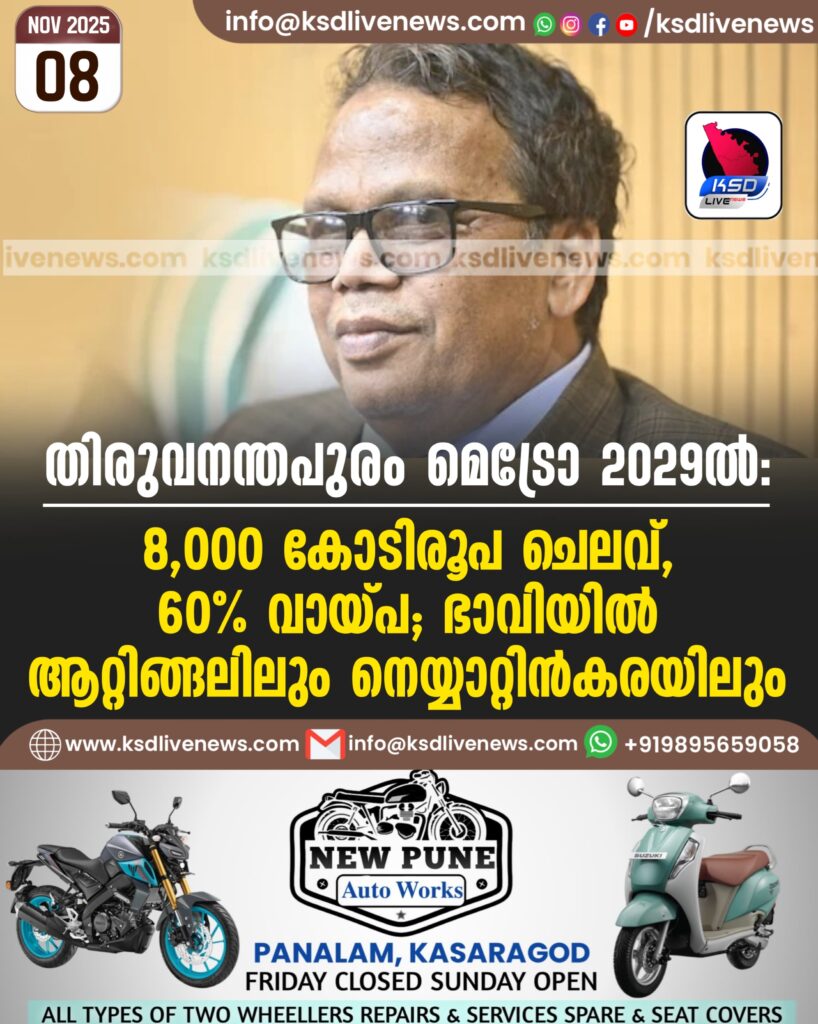 തിരുവനന്തപുരം മെട്രോ 2029ൽ: 8,000 കോടിരൂപ ചെലവ്, 60% വായ്പ; ഭാവിയിൽ ആറ്റിങ്ങലിലും നെയ്യാറ്റിന്കരയിലും