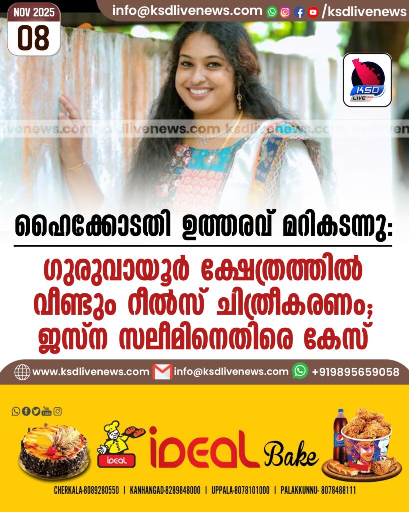 ഹൈക്കോടതി ഉത്തരവ് മറികടന്നു; ഗുരുവായൂർ ക്ഷേത്രത്തിൽ വീണ്ടും റീൽസ് ചിത്രീകരണം; ജസ്ന സലീമിനെതിരെ കേസ്