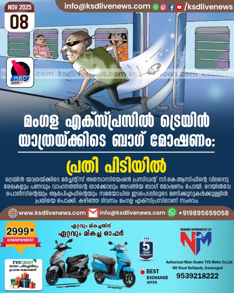 കാഞ്ഞങ്ങാട്: ട്രെയിൻ യാത്രയ്ക്കിടെ മർച്ചന്റ്സ് അസോസിയേഷൻ പ്രസിഡന്റ് സി.കെ.ആസിഫിന്റെ വിലപ്പെട്ട രേഖകളും പണവും വാഹനത്തിന്റെ താക്കോലും അടങ്ങിയ ബാഗ് മോഷണം പോയി. റെയിൽവേ പൊലീസിന്റെയും ആർപിഎഫിന്റെയും സമയോചിത ഇടപെടലിലൂടെ മണിക്കൂറുകൾക്കുള്ളിൽ പ്രതിയെ പൊക്കി. കഴിഞ്ഞ ദിവസം മംഗള എക്സ്പ്രസിലാണ് സംഭവം.