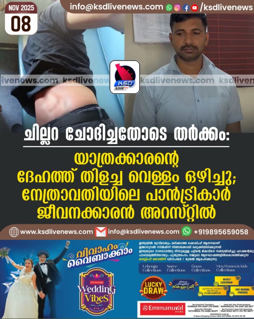 ചില്ലറ ചോദിച്ചതോടെ തർക്കം, യാത്രക്കാരന്റെ ദേഹത്ത് തിളച്ച വെള്ളം ഒഴിച്ചു; നേത്രാവതിയിലെ പാൻട്രികാർ ജീവനക്കാരൻ അറസ്റ്റിൽ